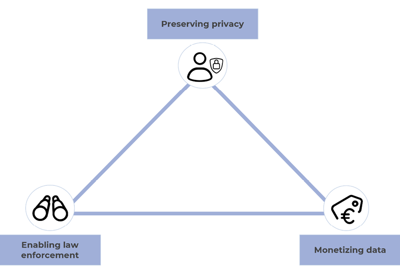 Adapting the terms originally chosen by Zygmuntowski (2023) to the objectives of digital payments, the three following objectives are identified: preserving privacy, given that the individual’s privacy is at stake when data is processed for a variety of purposes in a non-transparent manner; enabling law enforcement, as an objective representing a particular strand of the public interest; monetizing data to facilitate or sustain data-driven business models (see Figure 1).