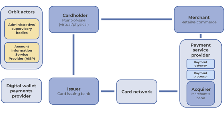 This basic architecture of a card-based payment, also known as the four corners model, includes the cardholder, the cardholder’s bank (“the issuer”), the merchant, and the merchant’s bank (“the acquirer) (Bindseil et al., 2023, p. 37). In addition to these four corners, a card network and a PSP are generally required for a payment to proceed (CNIL, 2021, p. 29). In the context of this research, these are complemented by providers of digital wallet payments and orbit actors, that is, actors who operate outside the payment processing chain and use data to enable law enforcement or develop use cases based on data, e.g. aggregating account information from multiple bank accounts.